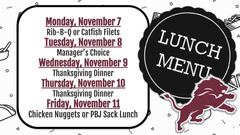 Breakfast for Lunch French Toast Scrambled Eggs Sausage Garden Salad Fruit Drink Selection 18 Turkey BLT on a Round Roll Chips Garden Salad Fresh Fruit Drink Selection 21 Meatloaf w. They look forward to. May 4thVirtual Parent Support Group Meeting 630pm Bread.